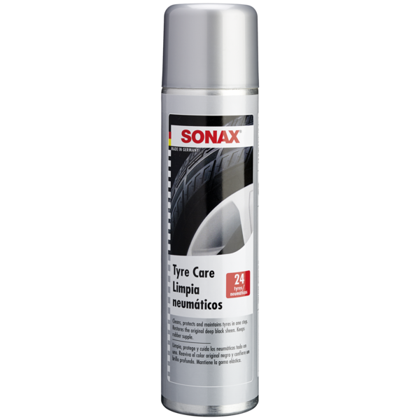 A SONAX Gumiabroncs Ápoló megtisztítja a szennyezett gumiabroncsot és visszaadja az időjárástól megkopott gumi eredeti mély fényét és telt színét. Ápolja a gumit, megtartja rugalmasságát és védi a kirepedezéstől. Aktív habja feloldja a szennyeződéseket, melyek a hab összeesése után könnyen leöblíthetők. A palack tartalma kb. 24 gumiköpeny kezelésére elegendő.